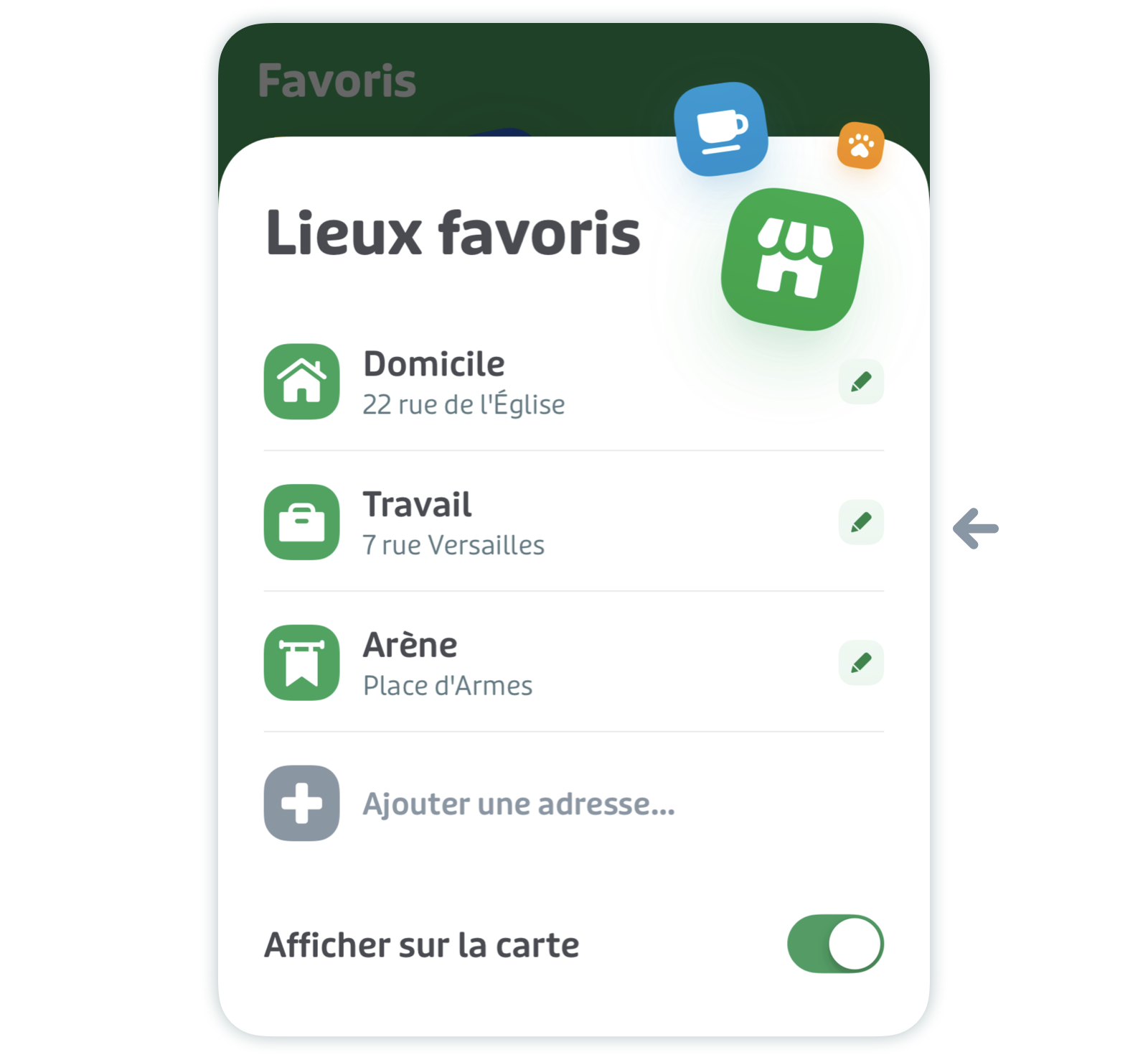 Appuyez sur l'icône du crayon à côté du lieu favori que vous souhaitez modifier.