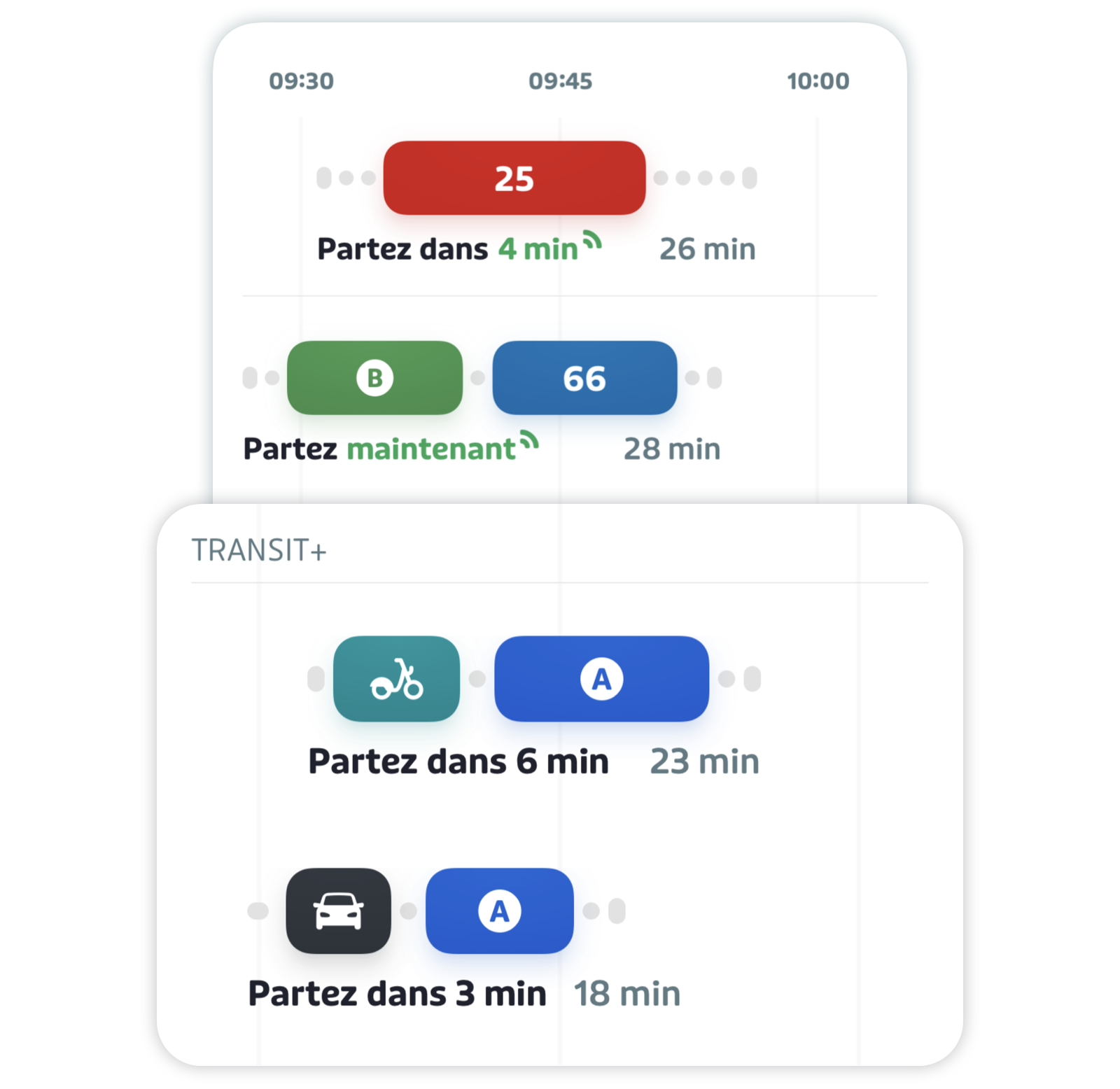 Transit+ offre présentement des suggestions de trajet qui combinent des options de vélopartage, de trottinettes, de courses à la demande et l'utilisation de votre propre vélo avec des services de bus, traversier, et train (pouvant inclure les métros, trains régionaux et tramways). Pour certaines villes, Transit+ offre également des trajets combinant les services de transport à la demande et le bus.