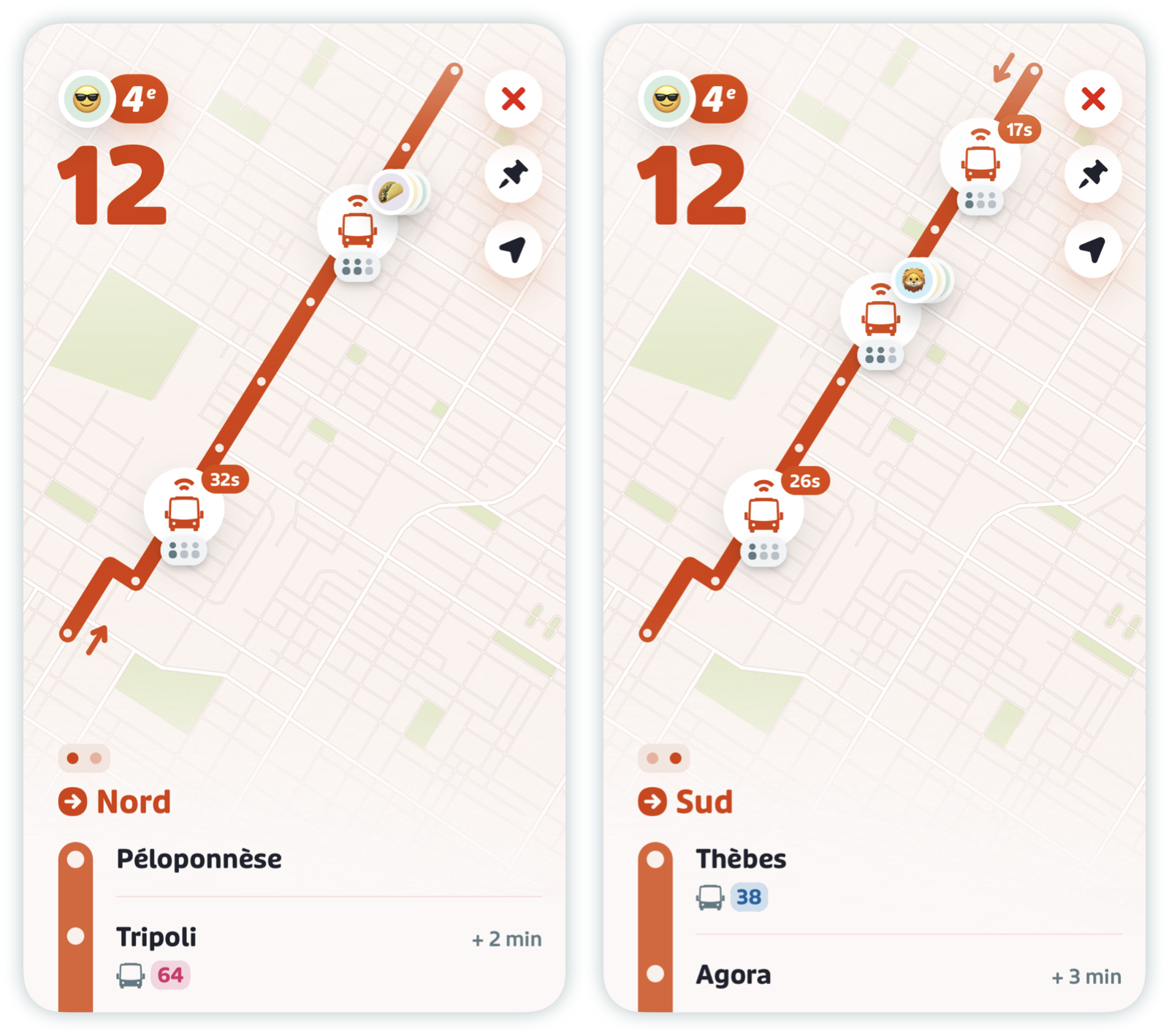 Comme partout dans l’application, les horaires en temps réel sont indiqués en gras et accompagnés de deux ondes radio, et les horaires planifiés s’affichent en gris.