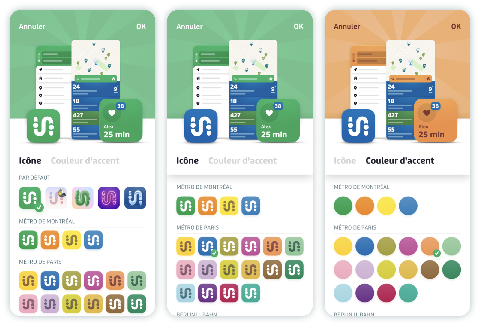 - Couleurs et icône personnalisées : Transformez Transit à votre image en personnalisant l’icône de l’appli et les couleurs dans l'appli.