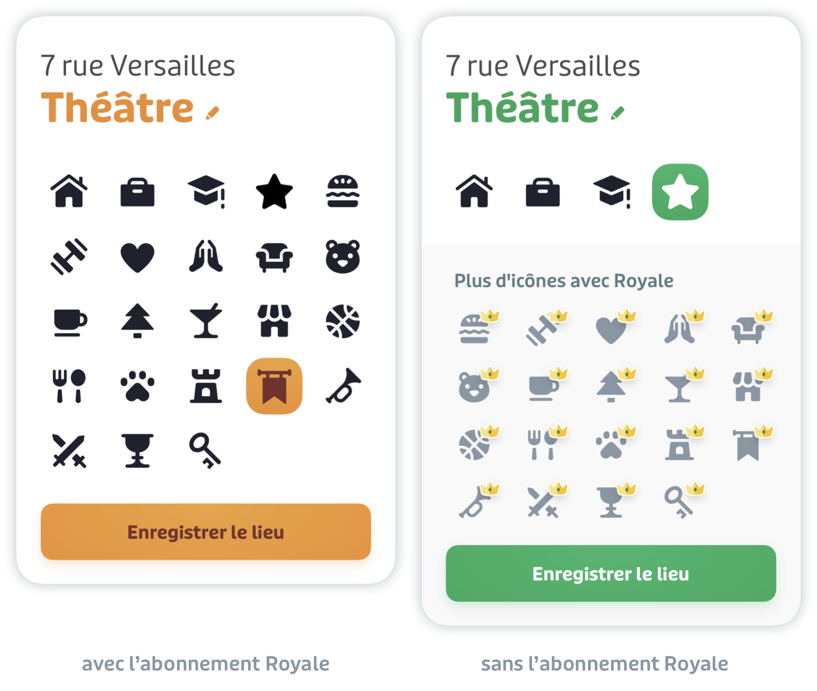 Avec l’abonnement à Royale, vous avez aussi accès à de nouvelles icônes pour mieux organiser vos lieux favoris.