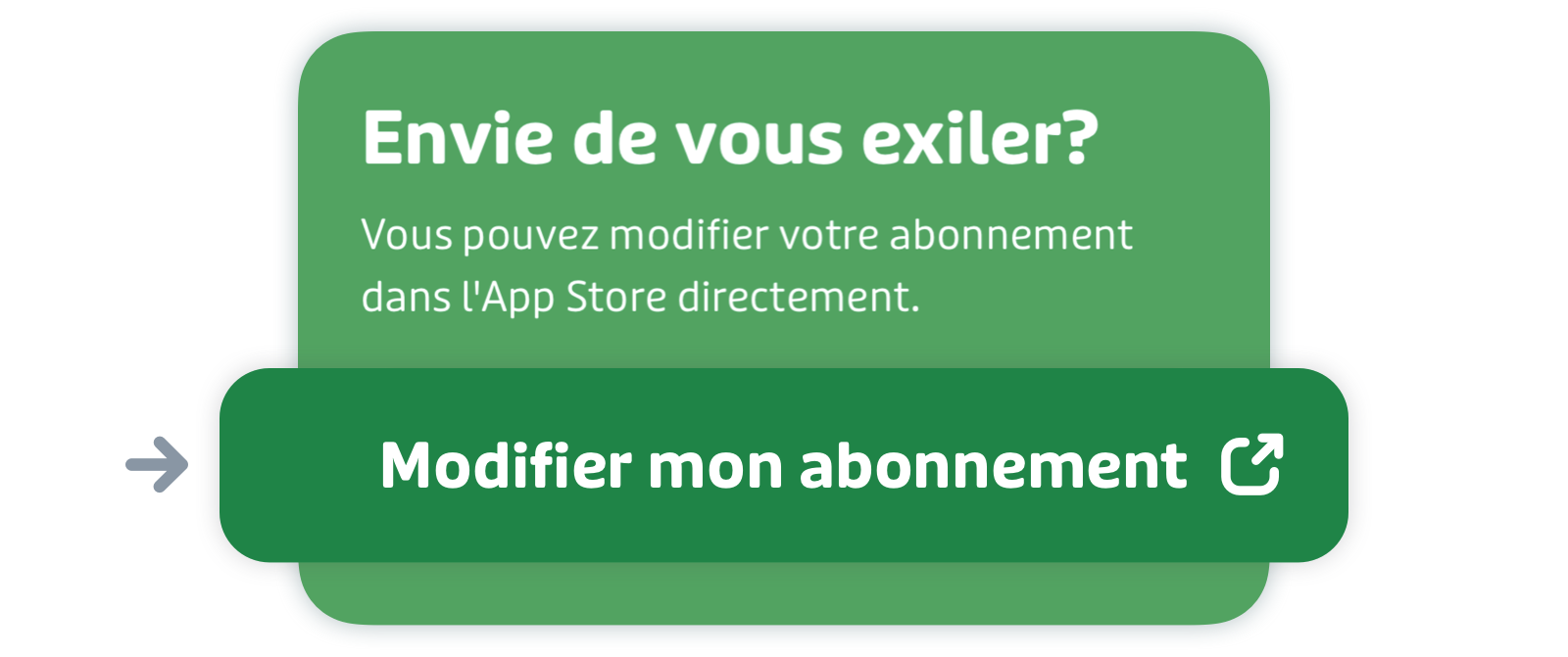 Faites ensuite défiler jusqu’à « Envie de vous exiler? » et appuyez sur « Modifier mon abonnement ». Le lien vous mènera directement vers l’App Store ou le Play Store où vous pourrez modifier votre type d’abonnement ou l’annuler.